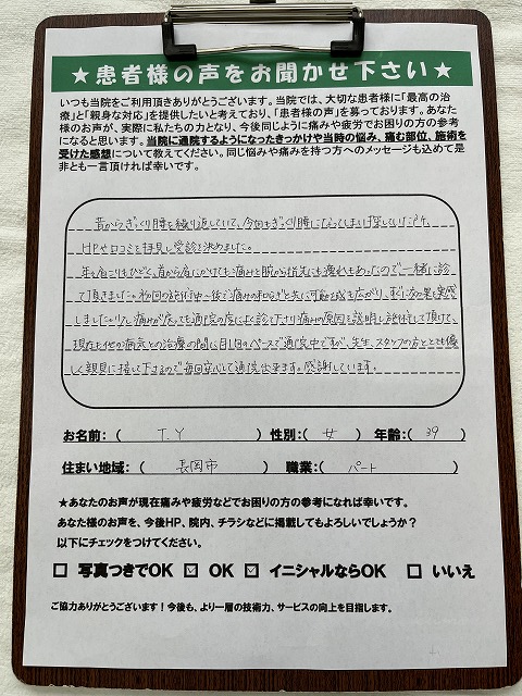 少し痛みが戻っても通院の度によく診てくださり、痛みの原因を説明し施術して頂けて、現在も他の病気との治療の間に月1回のペースで通院中ですが、先生、スタッフの方ととても優しく親身に接して下さるので、毎回安心して通院出来ます。