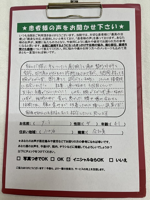 初回の施術中~後で痛みの和らぎと共に可動域も広がり、すぐに効果を実感しました。