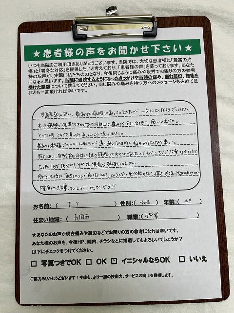 同じように事故でつらい思いをしている方に、ぜひおすすめしたい接骨院です。