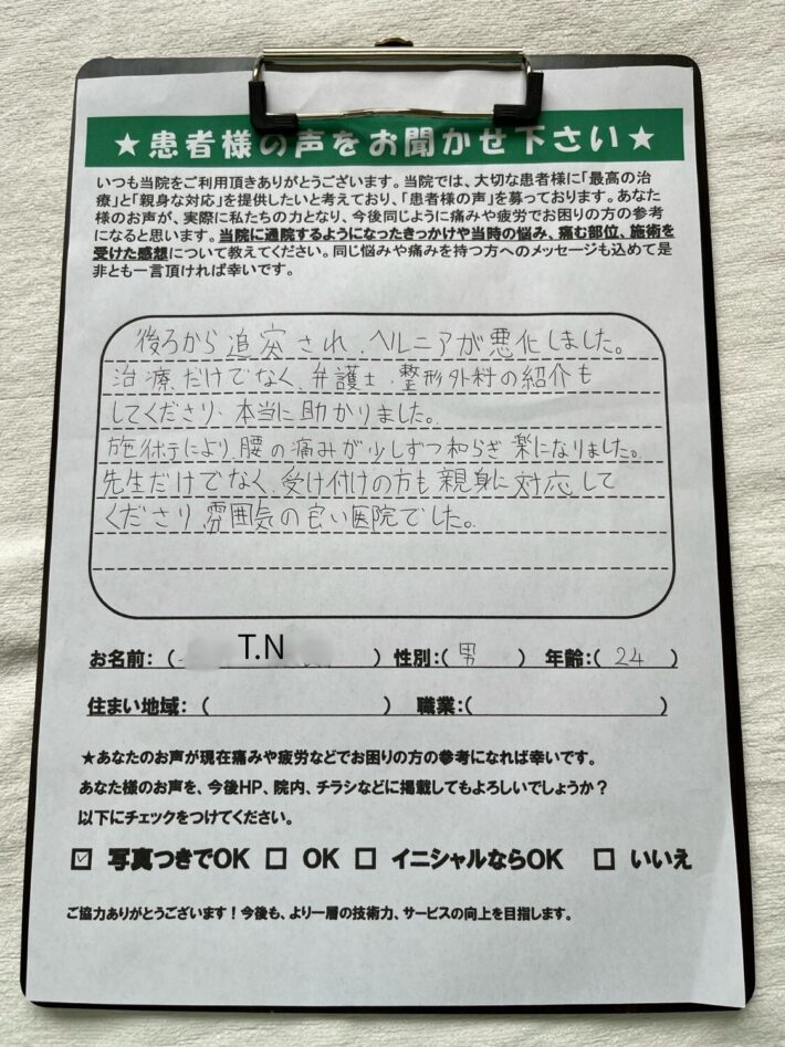 治療だけでなく、弁護士・整形外科の紹介もしてくださり、本当に助かりました。
